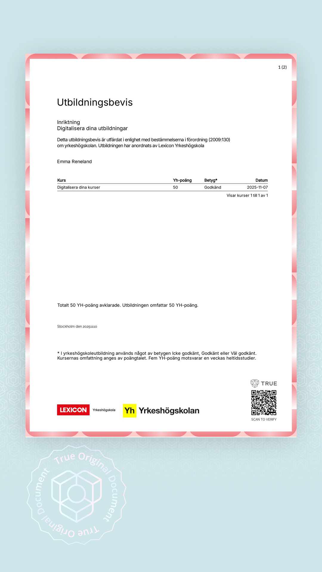 Detta diplom är säkrat med blockkedjeteknik från TRUE, vilket möjliggör verifiering av äktheten både i digital form och när dokumentet skrivs ut.